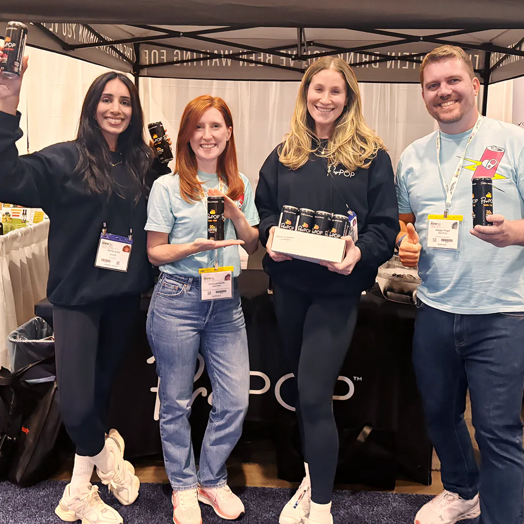 EN PHOTOS (en haut) : Les boissons pétillantes protéinées ProPOP Orange Pamplemousse et Mangue Pêche brillent dans nos canettes sleek 12 oz à finition mate; (en bas) : Amrita Johal (ProPOP), Véronique Guertin (Hart Print), Carly Demco (ProPOP) et Morgan Pingot (Hart Print) échangent lors d’un salon professionnel.